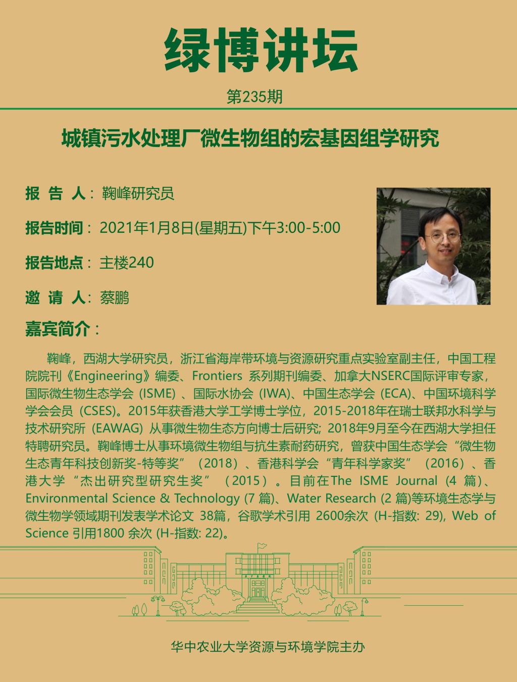 【绿博讲坛】城镇污水处理厂微生物组的宏基因组学研究