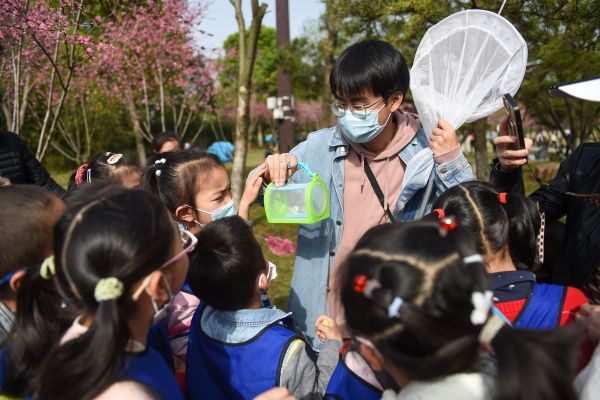 刘如达带同学们观察菜粉蝶。 摄影记者许巍魏摄