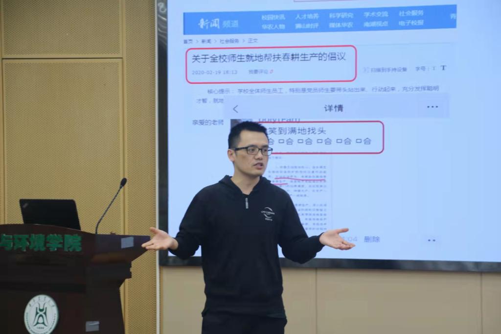“还记得那份《关于全校师生就地帮扶春耕生产的倡议》吗?”刘新伟以疫情防控和春耕生产重要时节,我校师生就地依法科学有序帮扶春耕备耕的事例为引,展开了“农业科技知识、智力优势与专业实践相结合”的话题,他谈到:“有同学觉得,一线生产离我们还很遥远,也有同学觉得,自己之所学难以指导生产一线,但实际上,我们的书本知识、科学研究都是在为解决实际问题奠定基石,广袤的农村也亟需大批农业科技人才提供智力支持。”