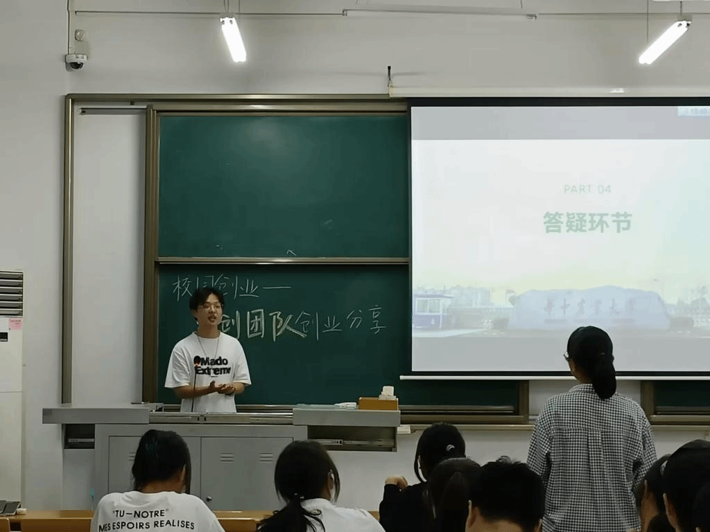(图2 陈子柯为同学们讲述创业团队成长历程)