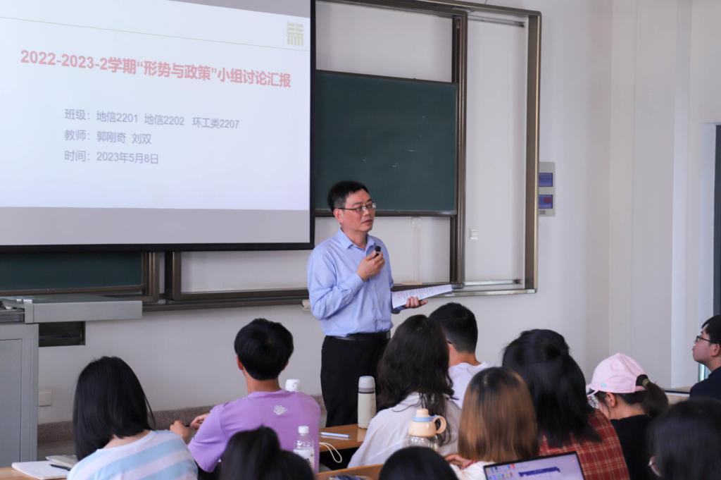 5月8日下午,校党委常委、副校长郭刚奇在第四教学楼A203教室为nba88看球 地信2201班、地信2202班及环工类2207班讲授《形势与政策》课程,马克思主义学院副教授刘双老师主持课堂。