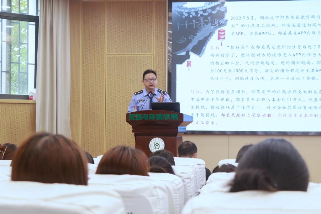 为进一步加强nba88看球 学生各项安全教育工作,切实落实好安全防范教育,预防和减少电信诈骗的发生,nba88看球 于5月11日在西附楼报告厅开展了主要学生骨干及寝室长安全教育培训,南湖派出所民警郭锋、周毅、辅导员艾力·斯迪克、汤春燕参加了本次培训。郭锋警官为大家作防诈骗分享。