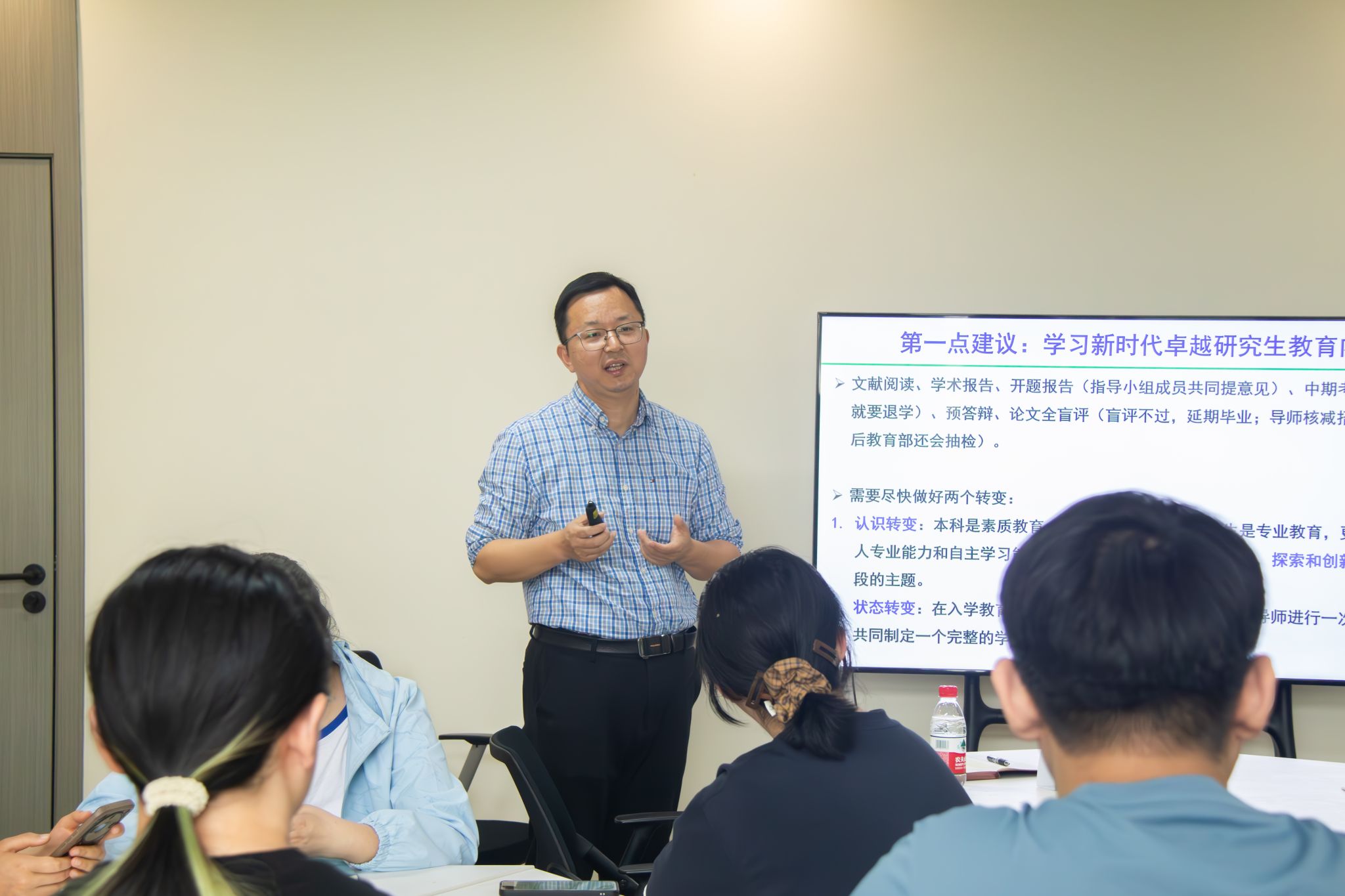 会议伊始,蔡鹏副院长以导师引领与学术成长为切入点,系统阐释了优秀人才培养规律。针对研究生阶段的学术成长,他提出三点核心建议。其一,“研究生阶段需在能力积累中寻求突破。”蔡鹏强调,本科生重视课程学习与基础能力培养,而研究生则需主动探索创新路径,其二,蔡鹏指出,“创新的前提是拥有扎实的学术功底与系统性思维”。否则,便是眼高手低。其三,他鼓励同学要多向优秀的身边人学习,以此来提升自我。在行动中明晰个人定位,既要珍惜当下、脚踏实地,亦需保持“可变性”,通过实践拓宽发展边界。最后,蔡鹏提出“与导师建立良性互动关系至关重要”,蔡鹏建议学生要主动沟通、积极反馈,以开放的姿态融入科研团队,实现学术能力与人格素养的双向提升。