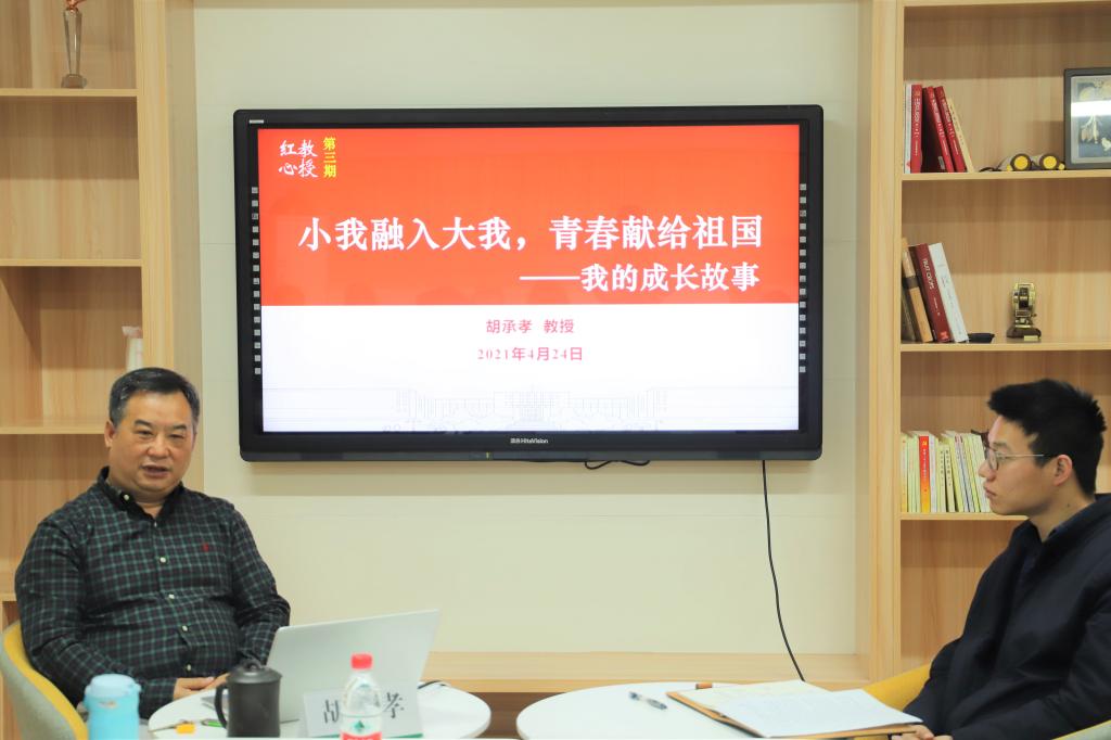4月24日上午,学院“教授红心工作室”第三期在主楼240会议室举办。胡承孝教授受邀参加本次活动,以“小我融入大我,青春献给祖国”为主题,向在场的30余名入党积极分子讲述了他自己的成长故事。