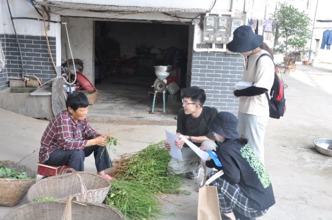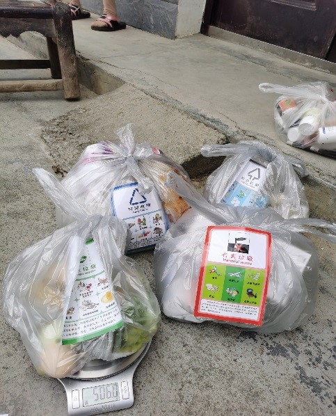 团队成员们入户与农户沟通,将贴有“厨余垃圾”、“可回收垃圾”、“有害垃圾”和“其他垃圾”分类贴纸的垃圾袋分发给所选取的农户,并向其详细科普四种垃圾所包含的组分。请居民们将二十四小时内产生的生活垃圾按分类投入相应的垃圾袋中;调研当日再从农户处收回四个垃圾袋,检查农户收集分类情况,若分类基本准确则按再进一步将可回收垃圾分类、称重、填表;若农户分类情况较差,队员们则自行将四袋垃圾准确分类后称重、填表;再以面对面访谈的形式对农户开展问卷调查。