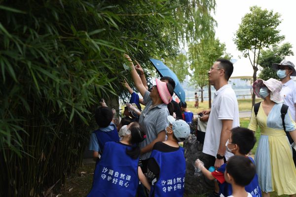 同学们且找且行,渐渐发现身边的蜻蜓、豆娘越来越多,刘如达解释道,蜻蜓喜欢潮湿、阴凉的自然环境,蜻蜓一般会在夏秋交替之际进行交配,并以“蜻蜓点水”的方式将卵产入水中,并慢慢发育成幼虫。沙湖公园环湖而建,越是靠近湖边的位置,越容易发现它们。来自如意宝贝幼儿园的程墨翟虽然才5岁,但却已经有了3年养虫的经验。在本次课程中,他还观察到了一只菌甲类的甲虫,他说“我最喜欢虫子,在观察虫子的时候,我们不能伤害它们,这样也是一种保护。”在自然导师们的带领下,同学们观察到了蜻、豆娘、飞蛾、菌甲类甲虫、马蜂、蚂蚁等十余种昆虫。