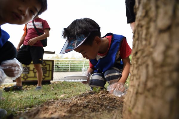 同学们用放大镜观察地上的蚂蚁。许魏巍 摄