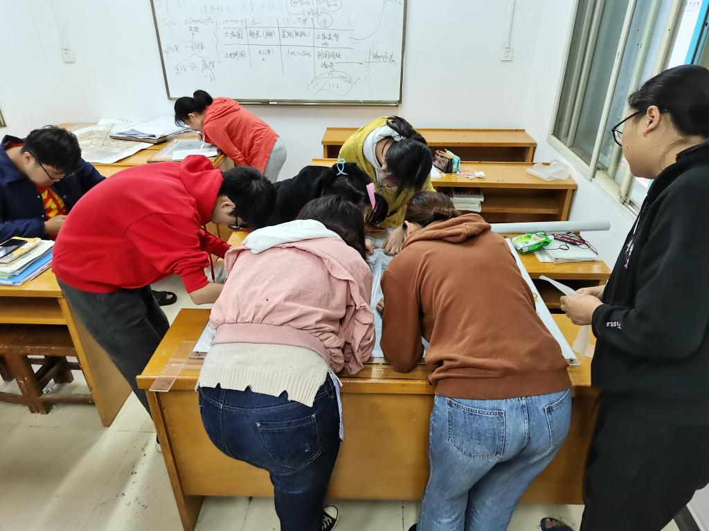 11月1日至5日,7个调查小组分别前往对应的调查区进行土壤类型调查及土地利用调查。同学们以航片为工作底图,根据路线调查和典型区域调查,逐步完成土壤类型图及土地利用类型图。在调查区域内,通过观察、访问、记载,必要时挖掘土壤剖面和进行剖面层次划分,进行土样采集,并测定土壤的pH值、石灰反应、质地等方法,对土壤种类、生产性能、土种分布范围和利用情况进行判断,在航片上划分土壤界限;依据土地用途、经营特点、利用方式和覆盖特征等因素,在航片上划分土地利用现状。