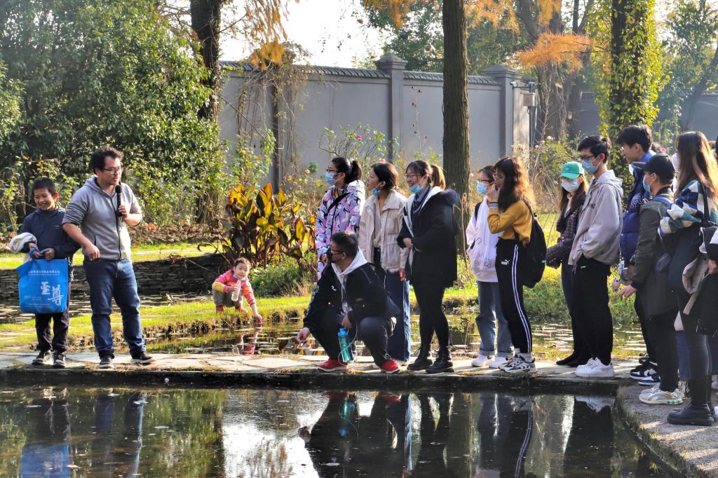 主题报告学习结束后,成员们一同前往武汉植物园,由武汉植物园副研究员操瑜、王伟带领大家参观学习。参观学习过程中对于水生植物资源圃、猕猴桃专类园、特有珍惜植物资源专类园、华中药用植物专类园等9个特色专类园内的植物与生长机制进行了探讨与交流。操瑜向同学们介绍到,武汉植物园是国家植物资源储备和植物迁地保护的综合研究基地,现收集保育植物资源12000余种,并且建有世界上涵盖遗传资源最广的猕猴桃专类园、东亚最大的水生植物资源圃、华中最大的野生林特果遗传资源专类园等。